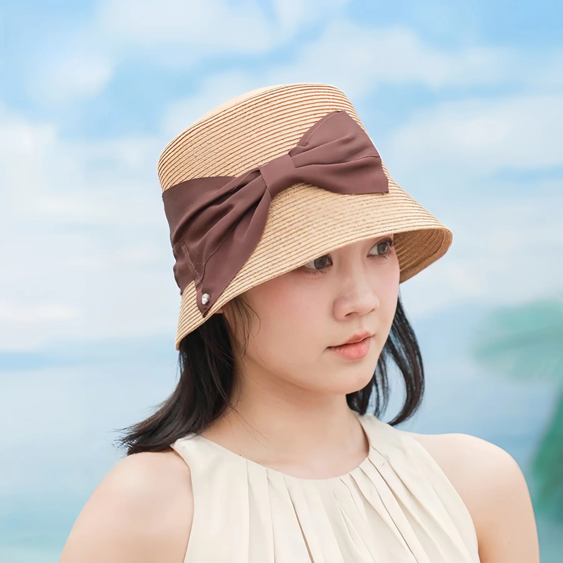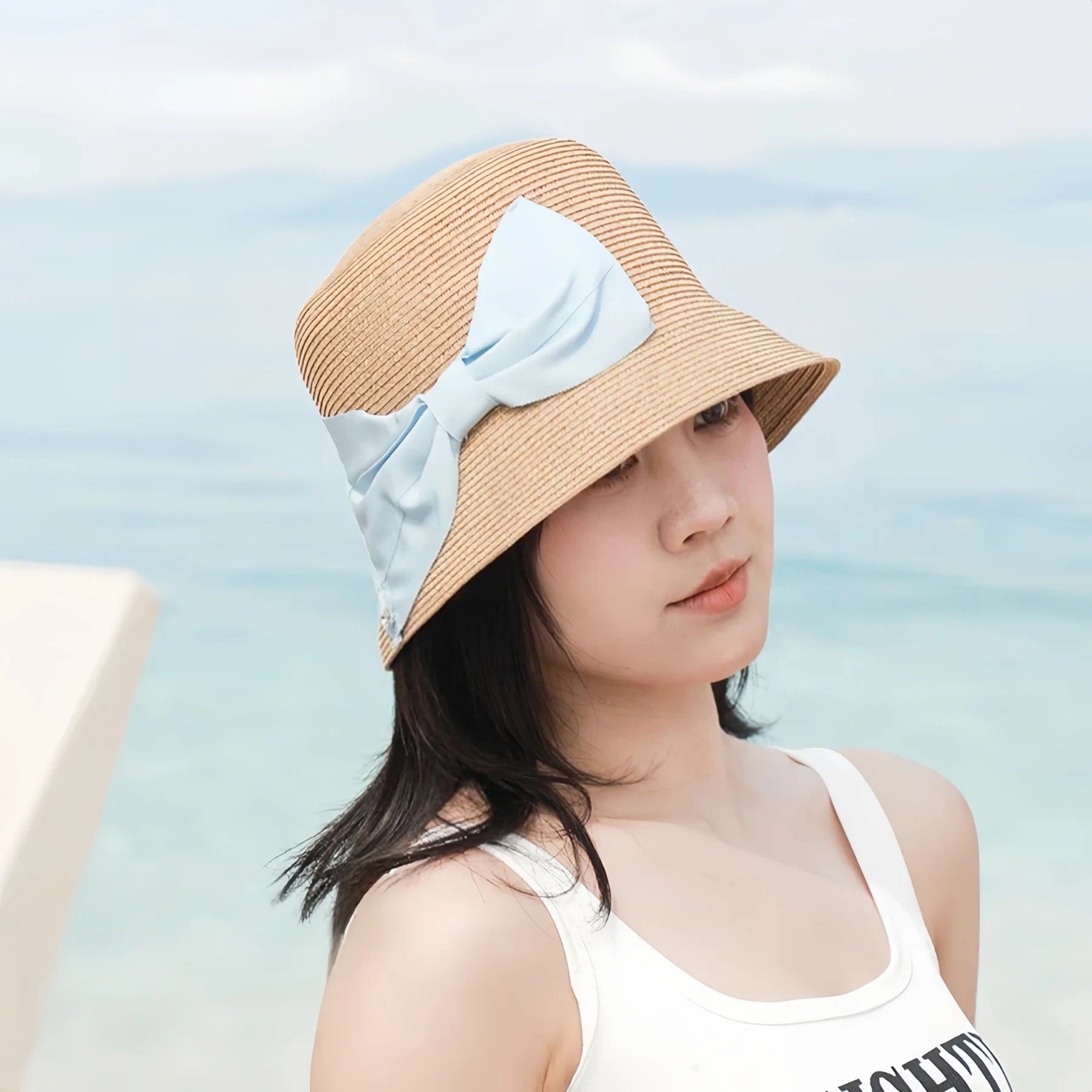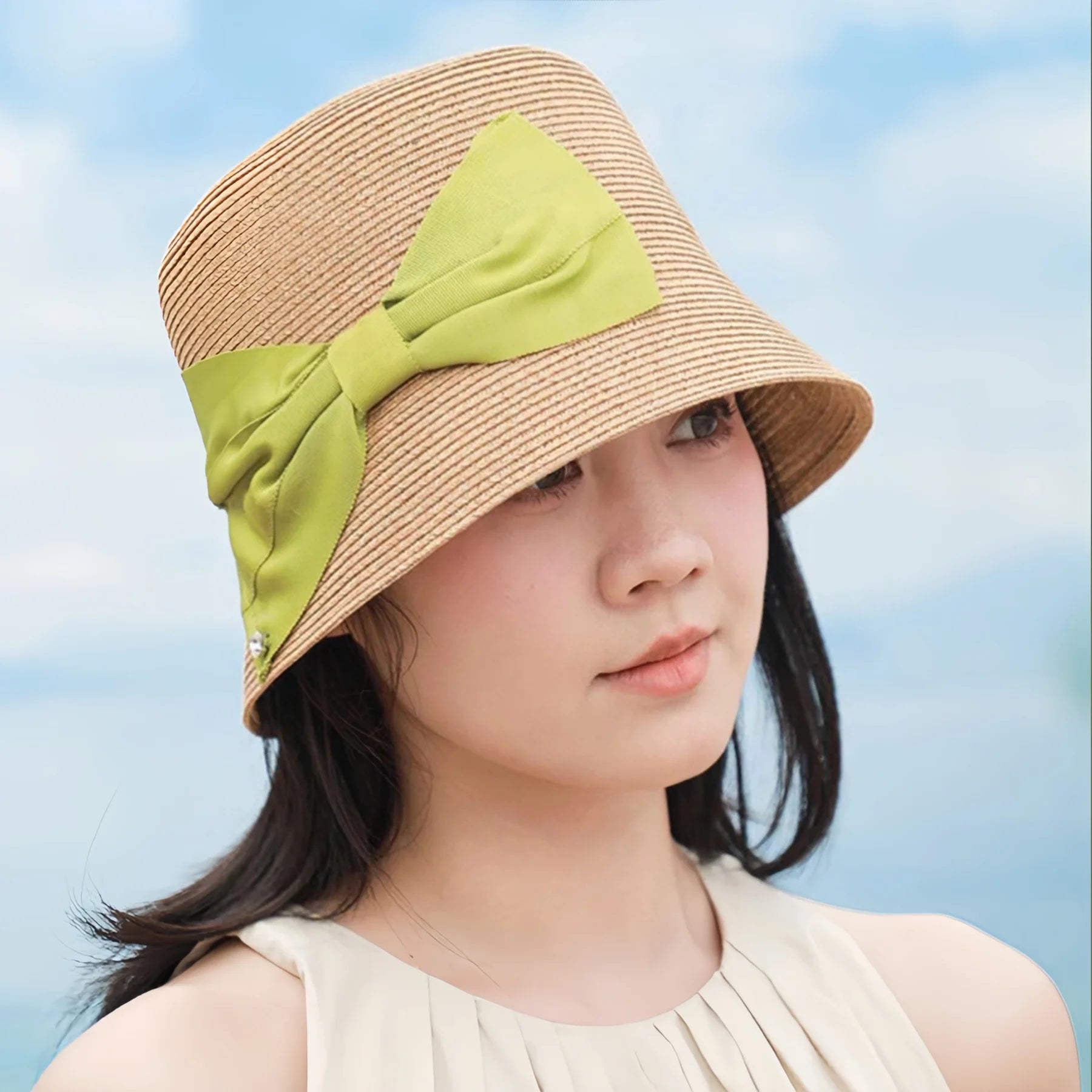 Give your summer outfits a soft vintage touch with this French-style straw bucket hat. Designed with a flat top and a gentle lampshade silhouette, it frames the face without feeling heavy, making it easy to wear from morning errands to seaside walks.