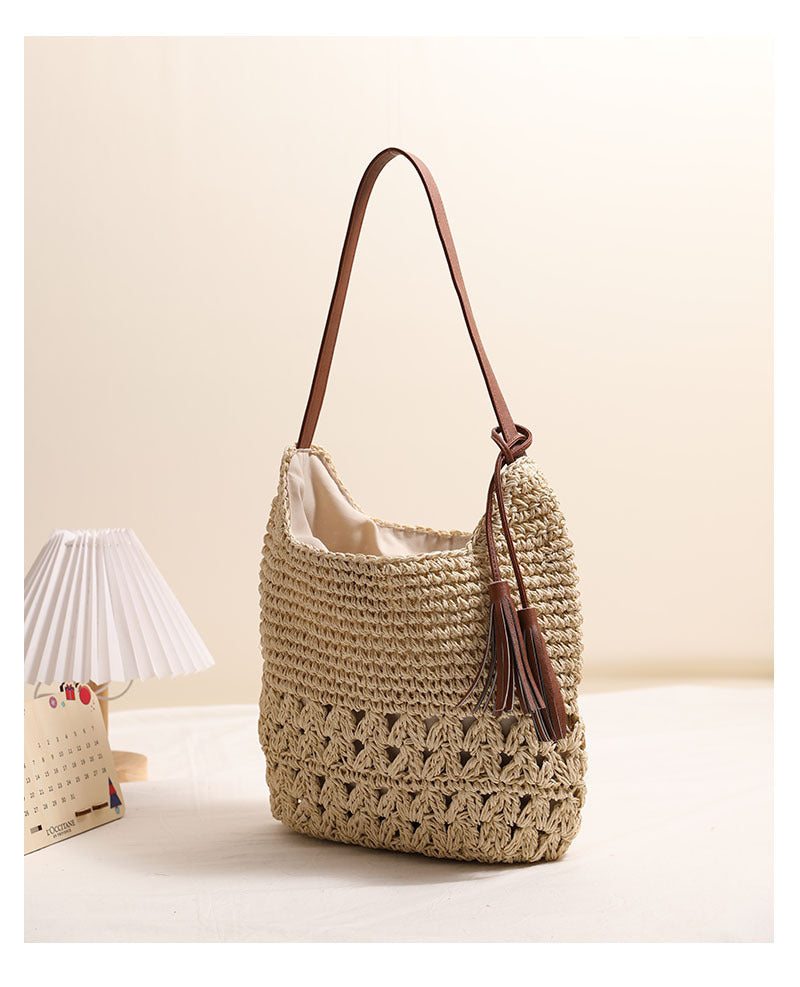 With its hollow-out pattern, contrasting heart tassel and two color options (coffee or beige), this bag adds a light, relaxed mood to dresses, linen sets or jeans. It’s sized for everyday essentials without feeling bulky, making it a practical choice for relaxed travel, brunch, or a beach afternoon.