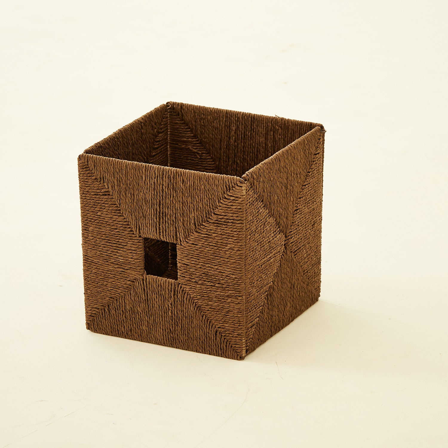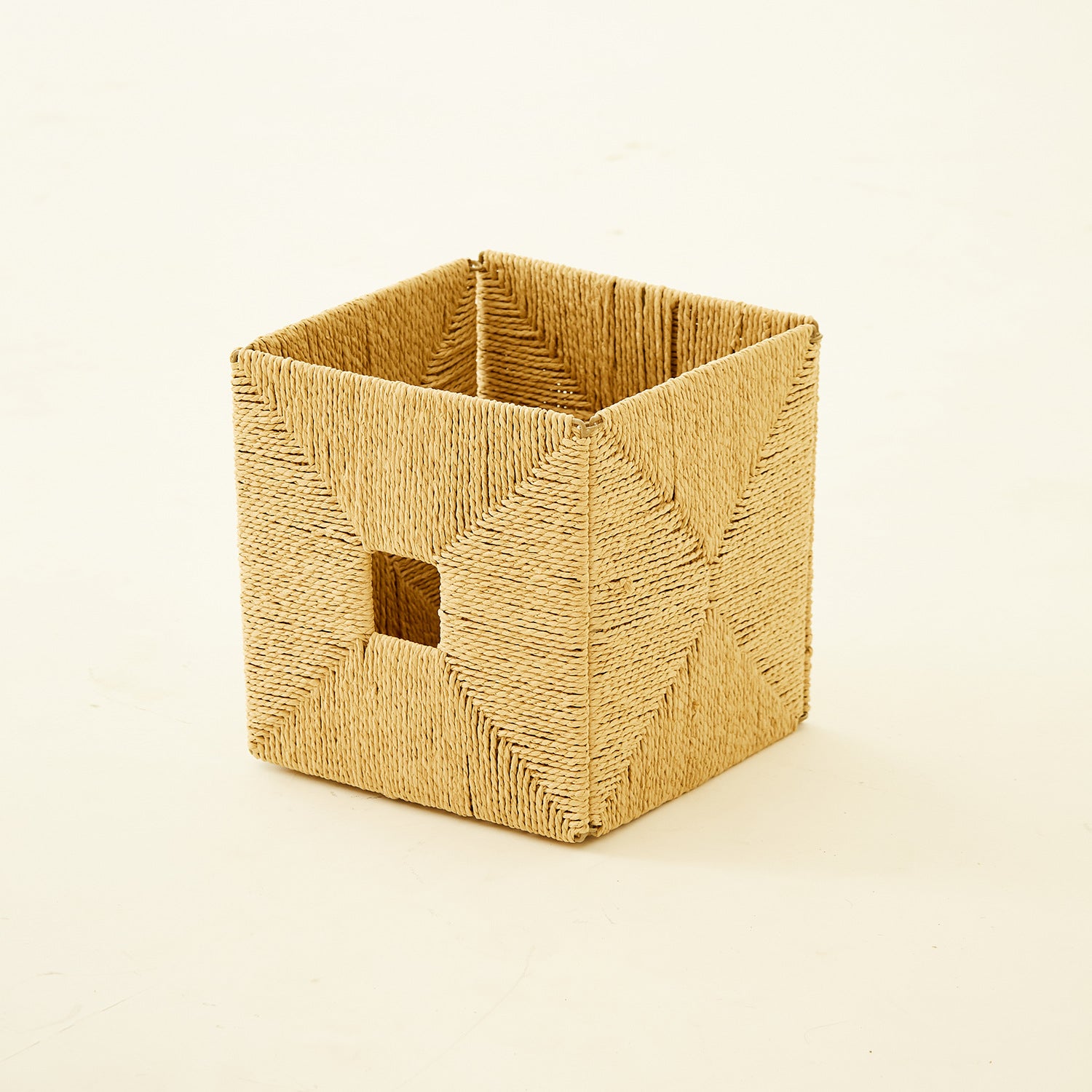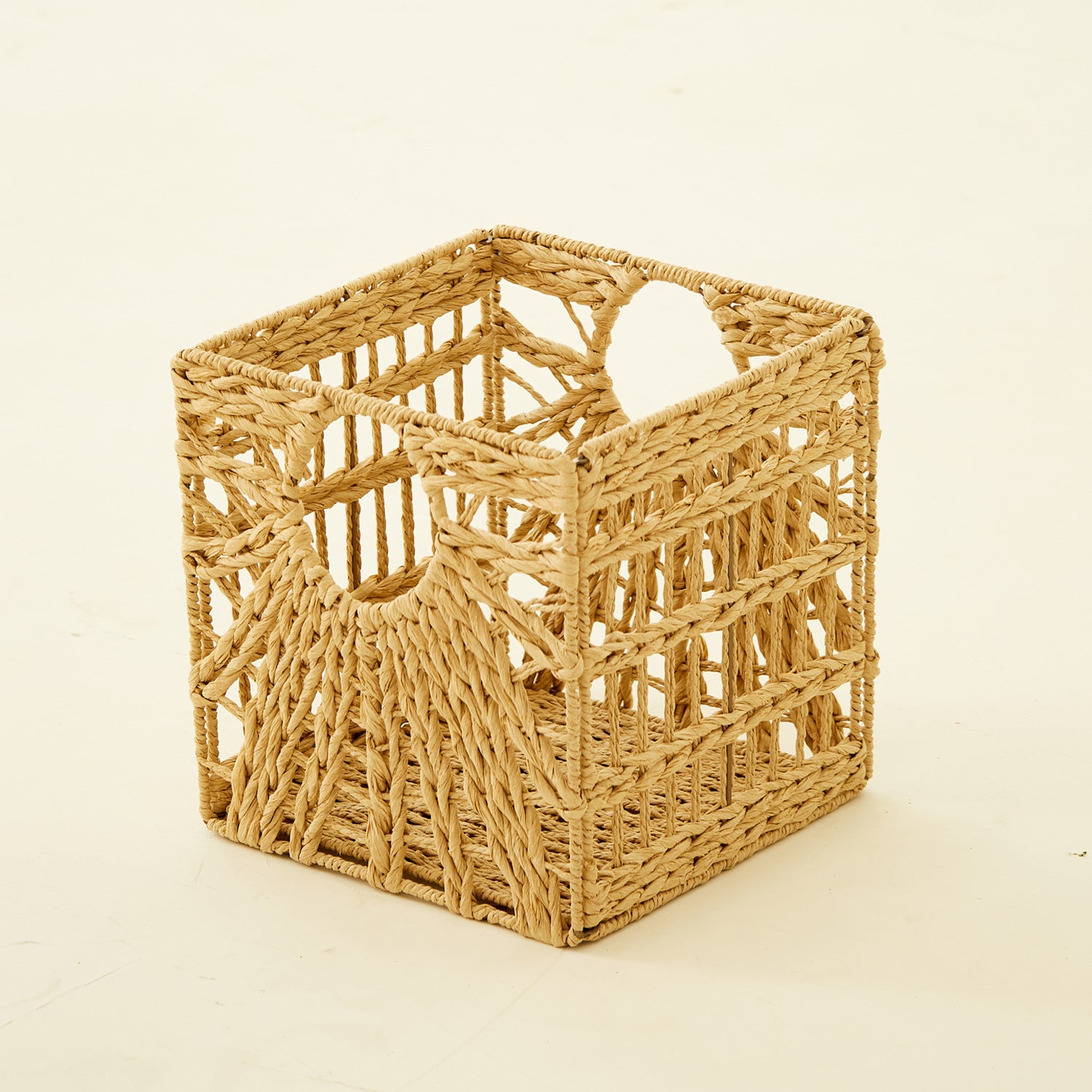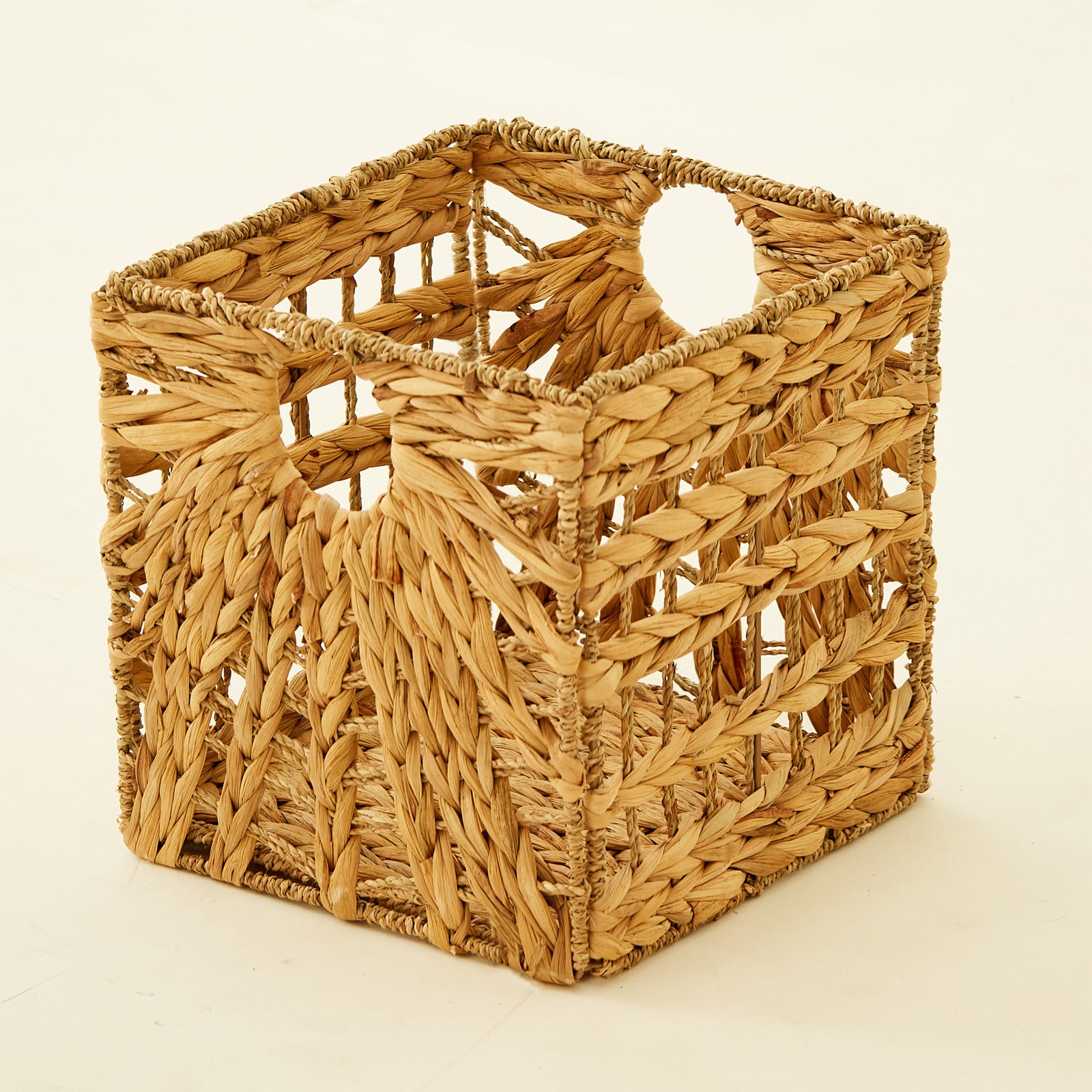 Structure: cube basket with side handles, openwork weave for a lighter visual feel